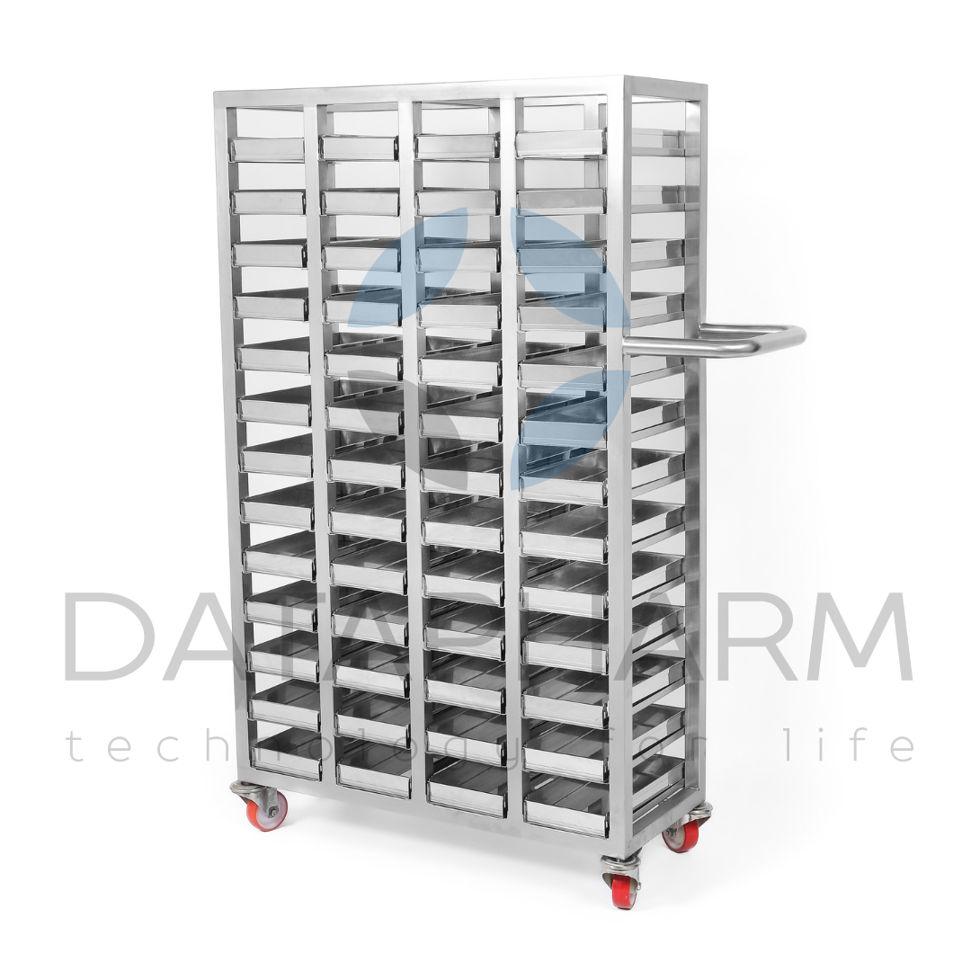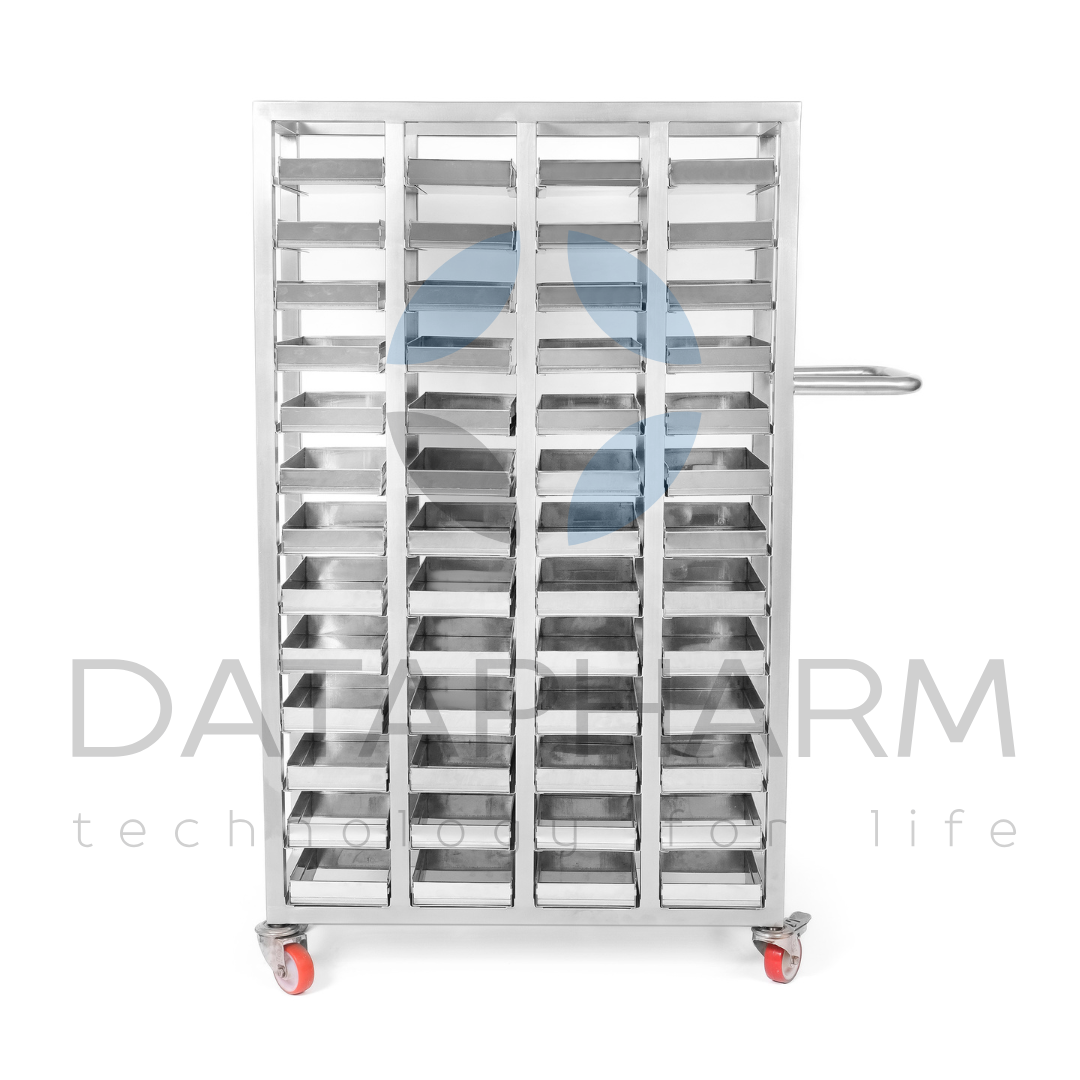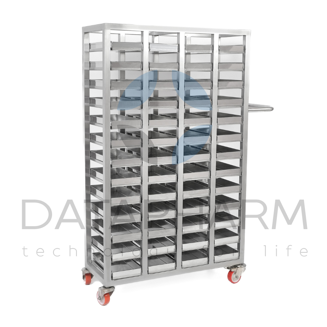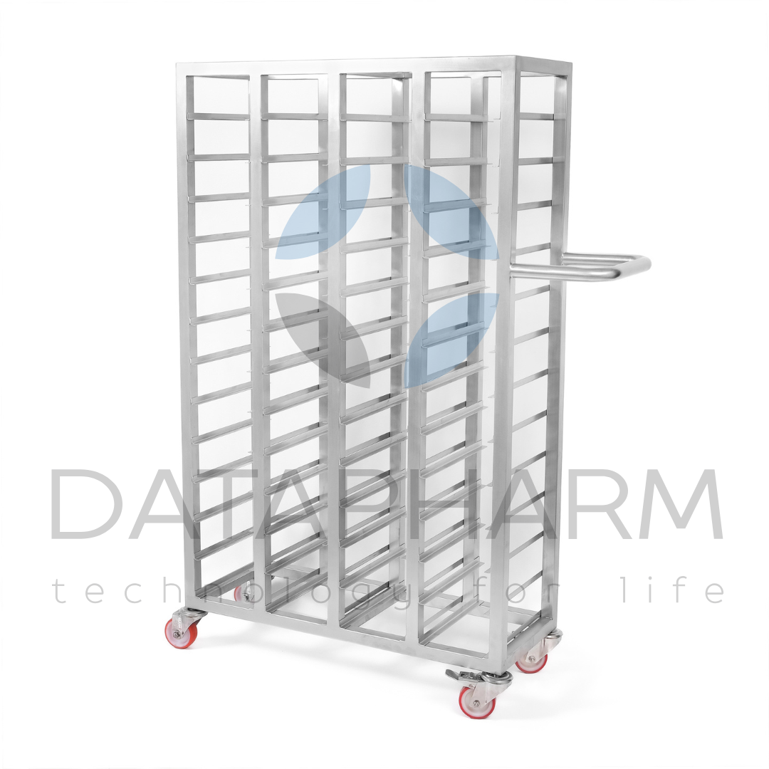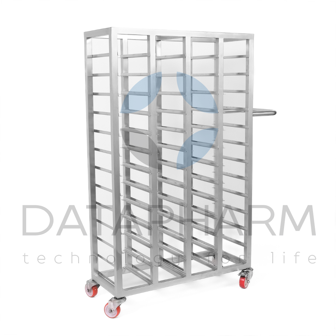 Czterosekcyjny wózek do transportu kaset przeznaczony jest do bezpiecznego przemieszczania kaset technologicznych, tacek i pojemników w strefach farmaceutycznych oraz produkcyjnych. Konstrukcja wykonana jest ze stali nierdzewnej AISI 304 lub AISI 316L i przystosowana do pracy w pomieszczeniach czystych. Układ czterech niezależnych sekcji zapewnia równomierny rozkład obciążenia oraz łatwy dostęp do każdej jednostki wsadu.