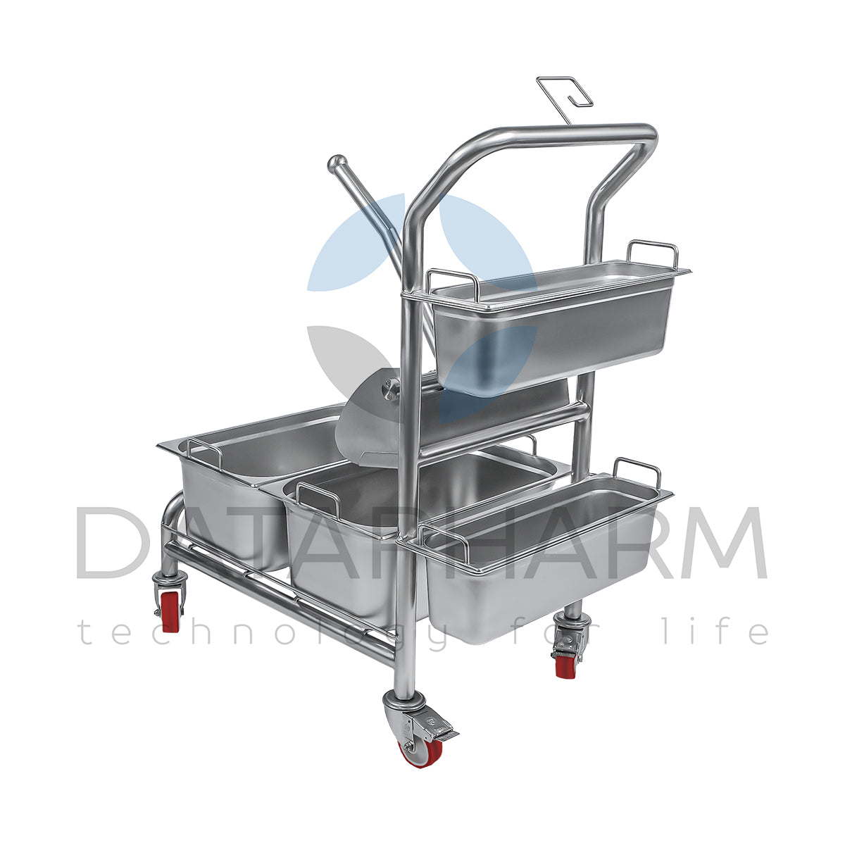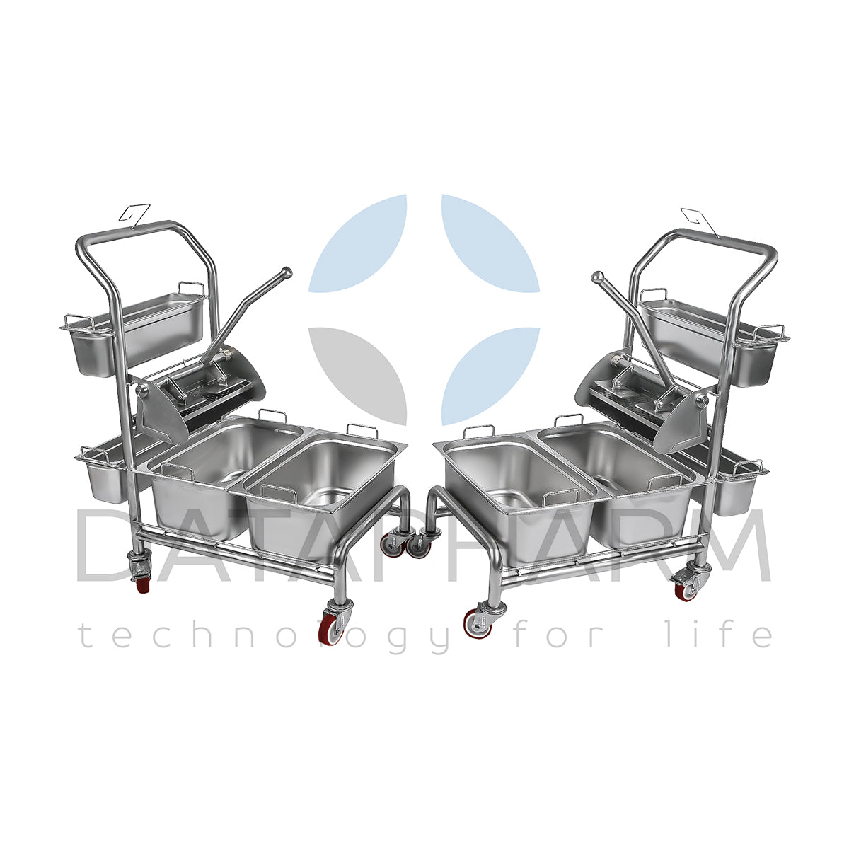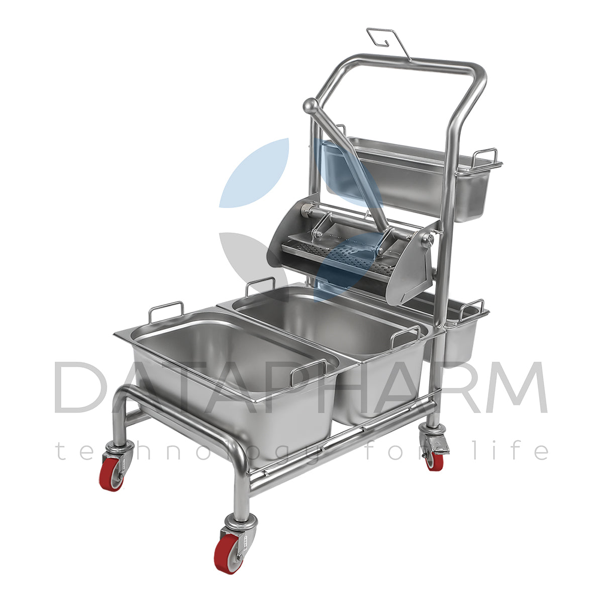 Wózek wyposażony jest w obrotowe kółka z blokadą, co zapewnia wysoką zwrotność w wąskich korytarzach oraz stabilność podczas użytkowania. Zintegrowany moduł wyciskania umożliwia kontrolę wilgotności narzędzi sprzątających, co ma kluczowe znaczenie dla utrzymania parametrów czystości. Konfiguracja może być dostosowana do SOP klienta, obejmując m.in. liczbę kuwet, typ wyciskarki, separację „czyste/brudne” oraz kodowanie kolorystyczne.