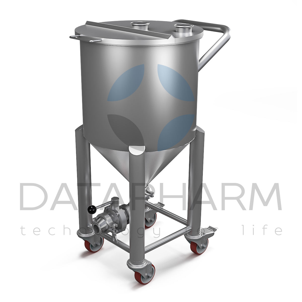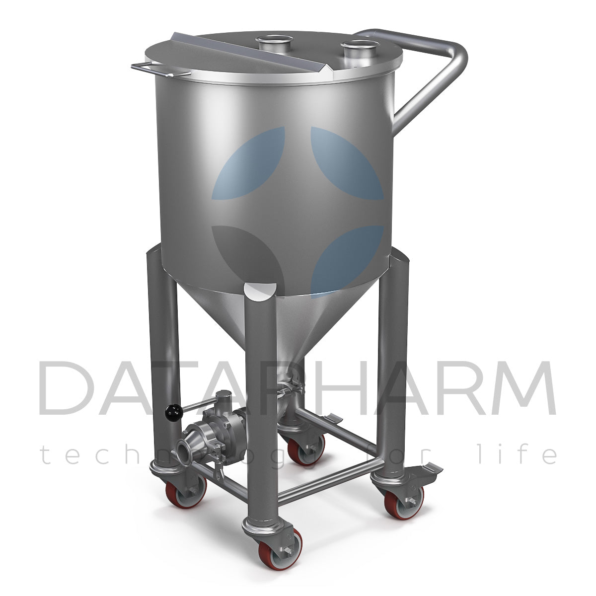 Dla usprawnienia logistyki wewnętrznej zbiornik wyposażono w cztery zwrotne koła, z których dwa posiadają hamulce dla stabilnego ustawienia. Powierzchnie wewnętrzne polerowane są do Ra ≤ 0,4 μm, co zapobiega przywieraniu produktu i ułatwia mycie.