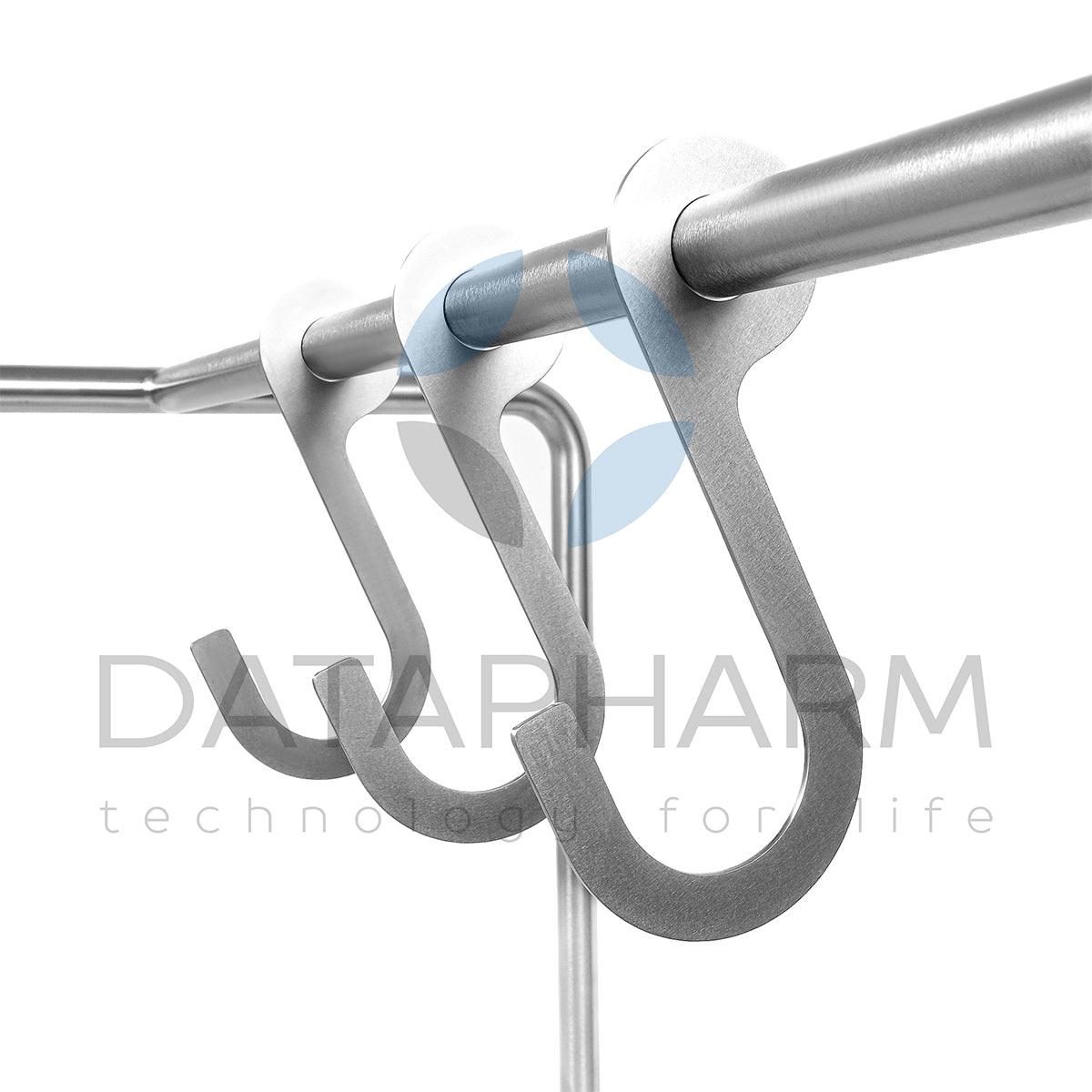 Стойка оснащается горизонтальной несущей балкой с гигиеническими крючками, рассчитанными на размещение шлангов различного диаметра и длины. Нижняя часть конструкции может быть дополнена поддоном из нержавеющей стали для сбора остаточной влаги либо временного размещения вспомогательных аксессуаров и фитингов.