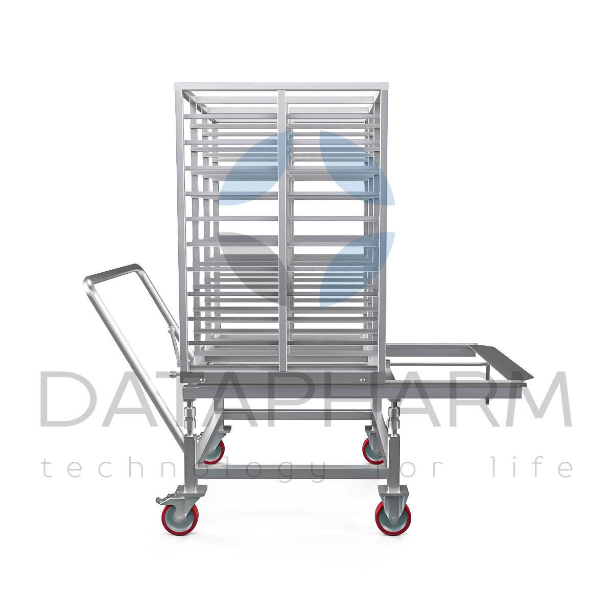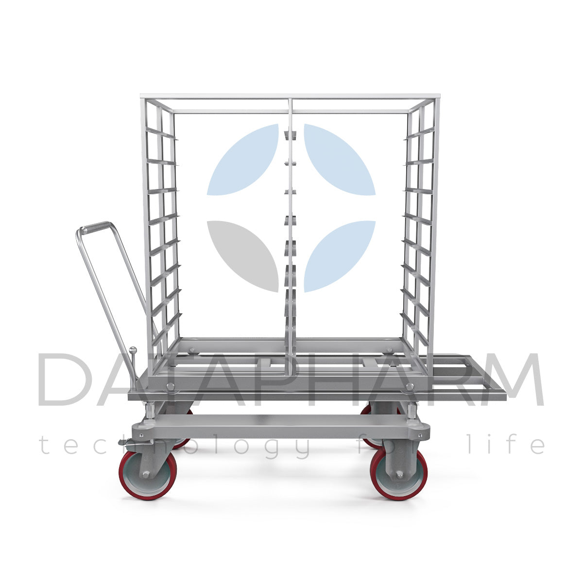 Завантажувальний візок у зборі розроблений як елемент внутрішньої логістики фармацевтичних, біотехнологічних і медичних виробництв. Конструкція забезпечує безпечне завантаження, позиціонування та переміщення касет під час технологічних операцій, миття або міжзонного транспортування.